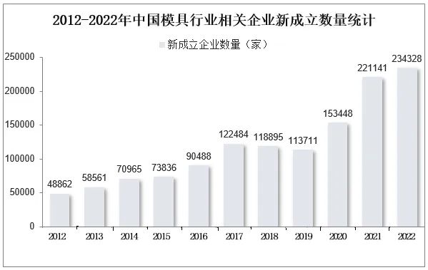 2022年全球模具行業(yè)規(guī)模超過2.1萬億元人民幣,中國模具行業(yè)市場規(guī)模超過3200億元人民幣。從行業(yè)競爭格局來看,模具行業(yè)屬于大行業(yè),2012年-2022年,國內(nèi)模具行業(yè)相關(guān)企業(yè)新成立數(shù)量由48862家增長到234328家?!颈疚臄?shù)據(jù)、圖表來源:華經(jīng)產(chǎn)業(yè)研究院、鳳凰網(wǎng)】