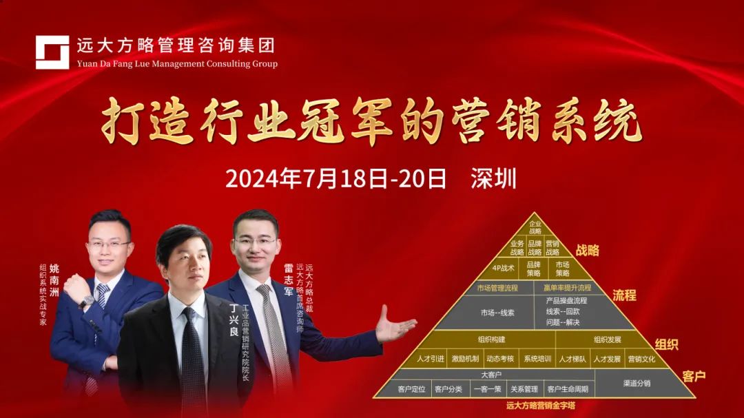 7月18日-20日,遠(yuǎn)大方略《打造行業(yè)冠軍的營銷系統(tǒng)》,三大實(shí)戰(zhàn)導(dǎo)師聯(lián)袂授課,深度剖析成功咨詢實(shí)戰(zhàn)案例,學(xué)會一套營銷系統(tǒng)打造的系統(tǒng)方法,實(shí)現(xiàn)可持續(xù)增長。