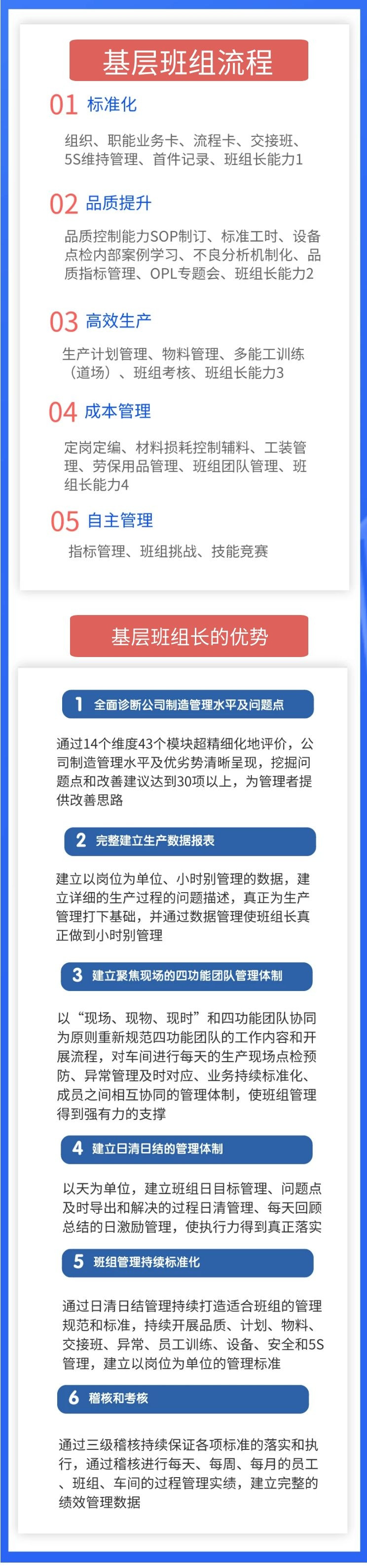 遠(yuǎn)大咨詢集團(tuán)根據(jù)100多家企業(yè)服務(wù)經(jīng)驗(yàn)開(kāi)發(fā)基層班組管理咨詢產(chǎn)品。以推進(jìn)班組管理各方面業(yè)務(wù)的標(biāo)準(zhǔn)化開(kāi)始,從班組管理規(guī)范化開(kāi)始,逐步推進(jìn)班組的品質(zhì)管理能力,效率管理能力,成本管理能力,逐步達(dá)到班組自主管理的程度。