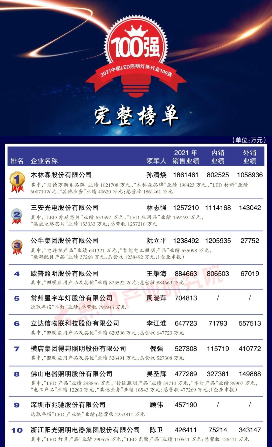 從銷售規(guī)模來看,中國led燈排行榜中有3家企業(yè)銷 售突破100億元,有4家企業(yè)銷售在50 100億元之間,有35家企業(yè)銷售在10-50億元之間,有35家企業(yè)銷售在5-10億元之間,余23家企業(yè)銷售在5億元以下。