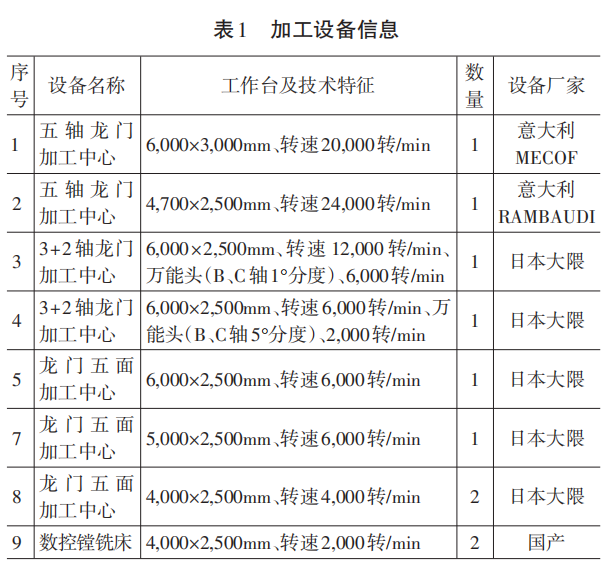 加工設(shè)備包括龍門五面加工中心4臺,五軸龍門加工中心2臺,3+2軸龍門加工中心2臺,數(shù)控機床2臺,搖臂鉆床3臺,能夠滿足承接各類汽車模具覆蓋件加工需求,主要加工設(shè)備情況如表1所示。