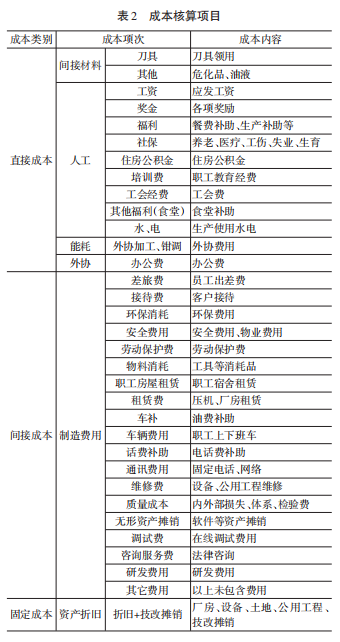按照汽車模具制造成本構(gòu)成情況,整理成本核算涉及項目如表2所示。