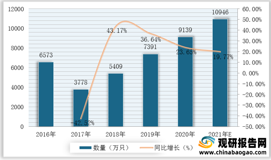 2016-2021年我國智能電表招標數(shù)量、增速及預(yù)測