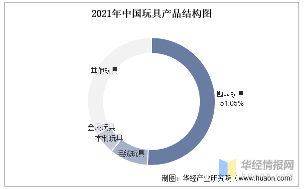 我國(guó)是全球最大的玩具制造國(guó),在世界玩具市場(chǎng)上占有舉足輕重的地位。從材質(zhì)上看,塑料玩具是我國(guó)玩具市場(chǎng)第一大細(xì)分品類,2021年塑料玩具的市場(chǎng)份額約為51.05%。