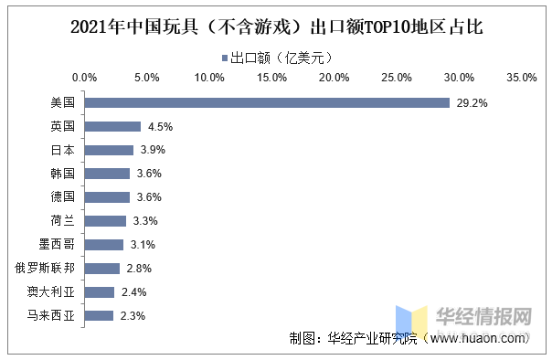 從出口目的地看,美國(guó)是第一大出口國(guó),2021年我國(guó)玩具(不含游戲)出口到美國(guó)的金額占比達(dá)到2.92%,其次是英國(guó)、日本、韓國(guó)、德國(guó)、荷蘭、墨西哥、俄羅斯聯(lián)邦、澳大利亞、馬來西亞等地。
