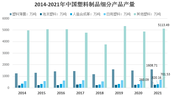 國內(nèi)塑料制品產(chǎn)品門類眾多,從細分市場來看,2021年我國塑料薄膜產(chǎn)量1608.71萬噸,占比20.1%;日用塑料產(chǎn)量701.53萬噸,占比8.76%;人造合成革產(chǎn)量320.16萬噸,占比4%;泡沫塑料產(chǎn)量260.09萬噸,占比3.25%;其它塑料產(chǎn)量5113.49萬噸,占63.89%。