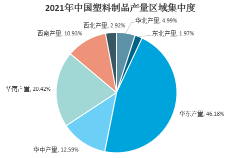 從生產(chǎn)的區(qū)域分布來看,國內(nèi)塑料制品生產(chǎn)集中在華東、華南、華中地區(qū)。2021年,華東地區(qū)塑料制品產(chǎn)量3696.28萬噸,占全國的比重為46.18%。華南地區(qū)發(fā)展迅速,塑料制品產(chǎn)量1634.36萬噸,占比20.42%。華中地區(qū)塑料制品產(chǎn)量1007.66萬噸,占比12.59%。其他地區(qū)塑料制品產(chǎn)量均在千萬噸以下,其他地區(qū)合計占比20.81%。