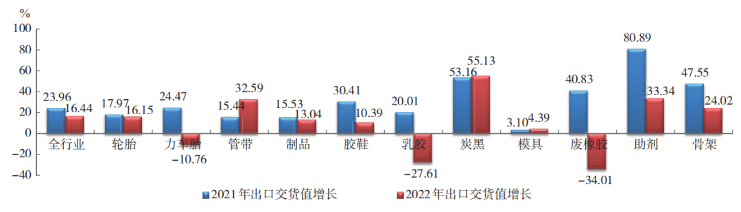 2022 年,橡膠行業(yè)完成出口交貨值增長16.44%,但較上年度增幅減少了 7.52 個百分點;行業(yè)出口率(值)為 34.72%,增加3.78個百分點。