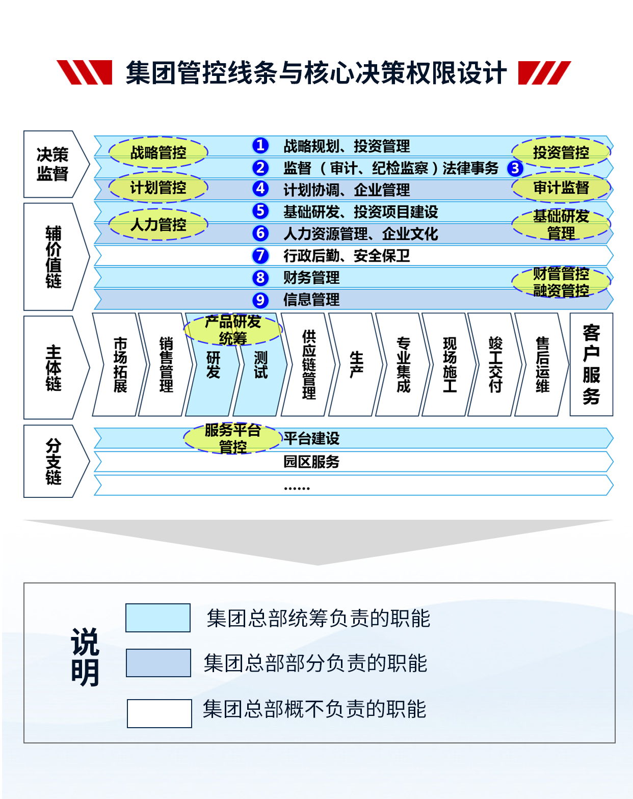 4、項(xiàng)目成果:支撐集團(tuán)戰(zhàn)略落地,提高集團(tuán)整體的運(yùn)營(yíng)效率;減少因跨層次管理帶來(lái)的損耗,提高集團(tuán)內(nèi)部資源配置效率;建立一套廣譜、可復(fù)制的管控模式;解決集團(tuán)因跨區(qū)域、跨體制、高速發(fā)展帶來(lái)的失控問(wèn)題,確保集團(tuán)高效運(yùn)作;理順管控價(jià)值基礎(chǔ),實(shí)現(xiàn)集團(tuán)整體價(jià)值的最大化;打造強(qiáng)勢(shì)總部,解決集團(tuán)總部空心化、文職化等問(wèn)題。